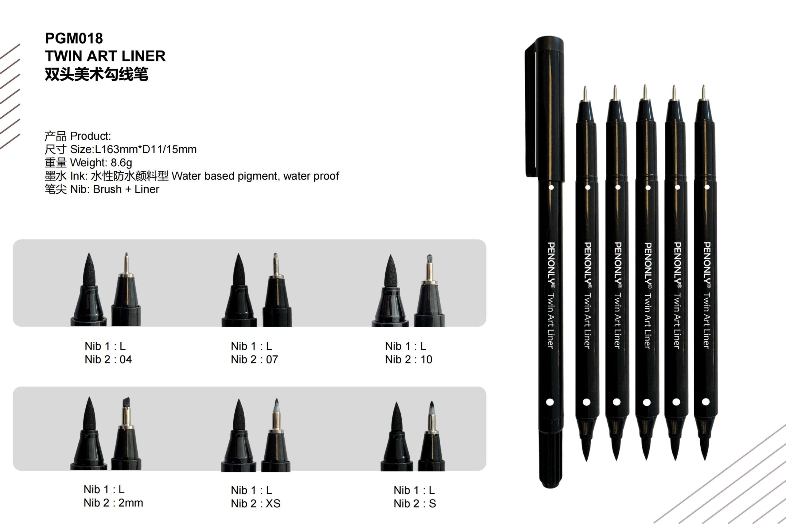 It would be more convenient while sketching: 2 nibs in one. Unique liner nib plus L sized brush. High qualified pigment ink. Water based and water proof.